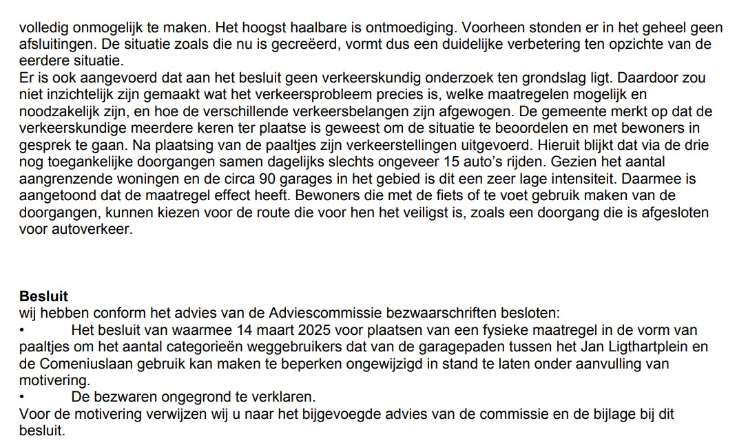 Onderstaand vind je de officiële tekst. Korte samenvatting: alle bezwaren afgewezen, paaltjes blijven waar ze nu staan.